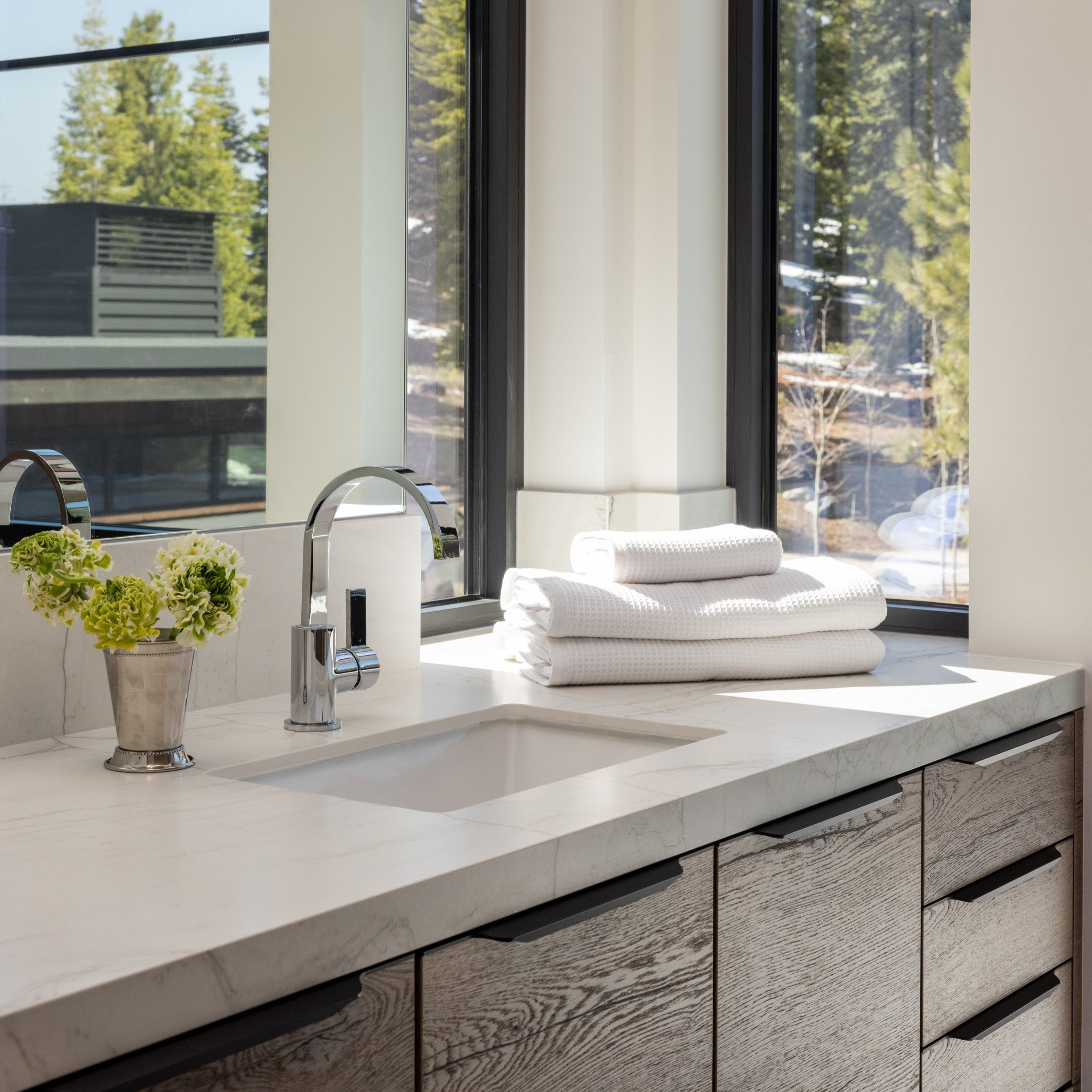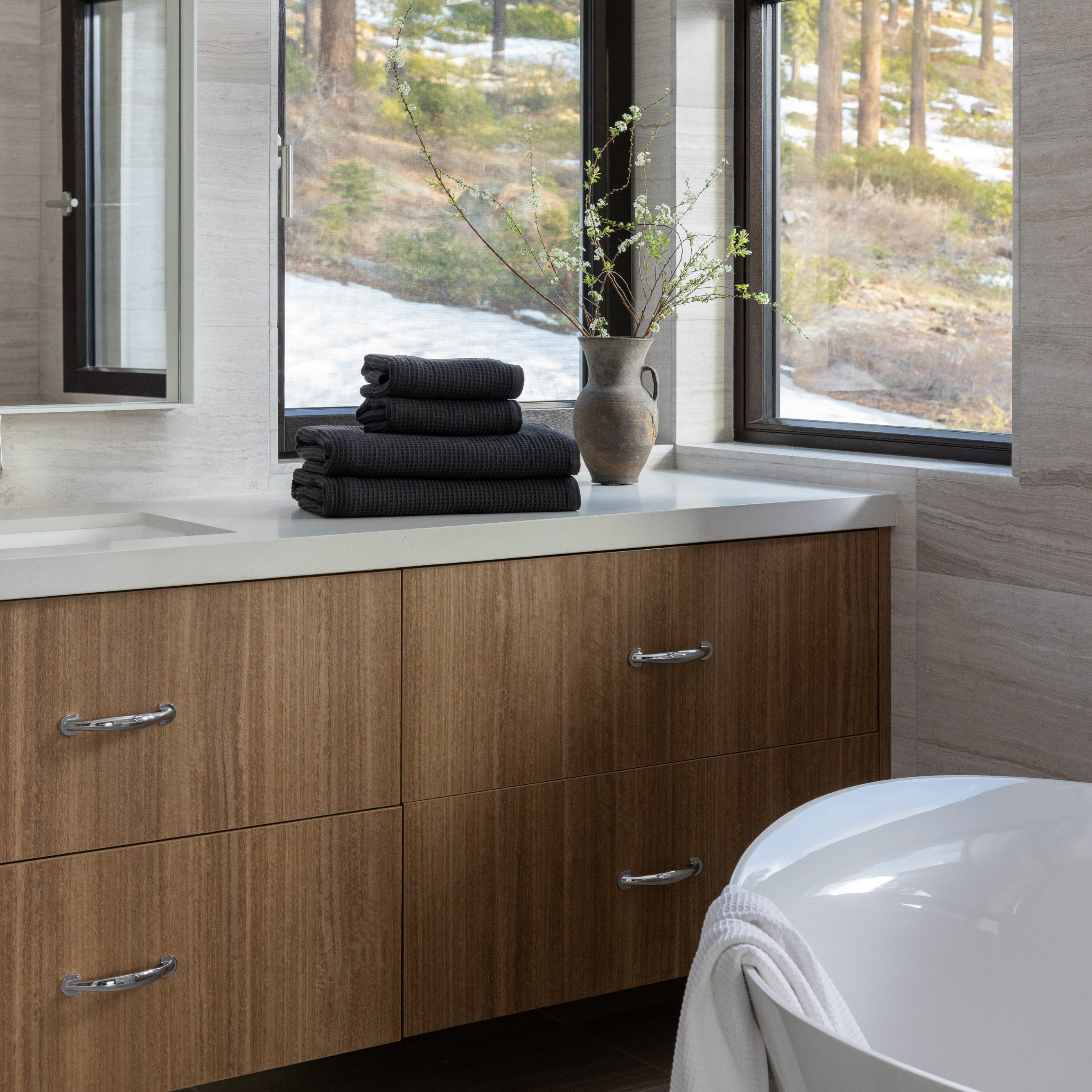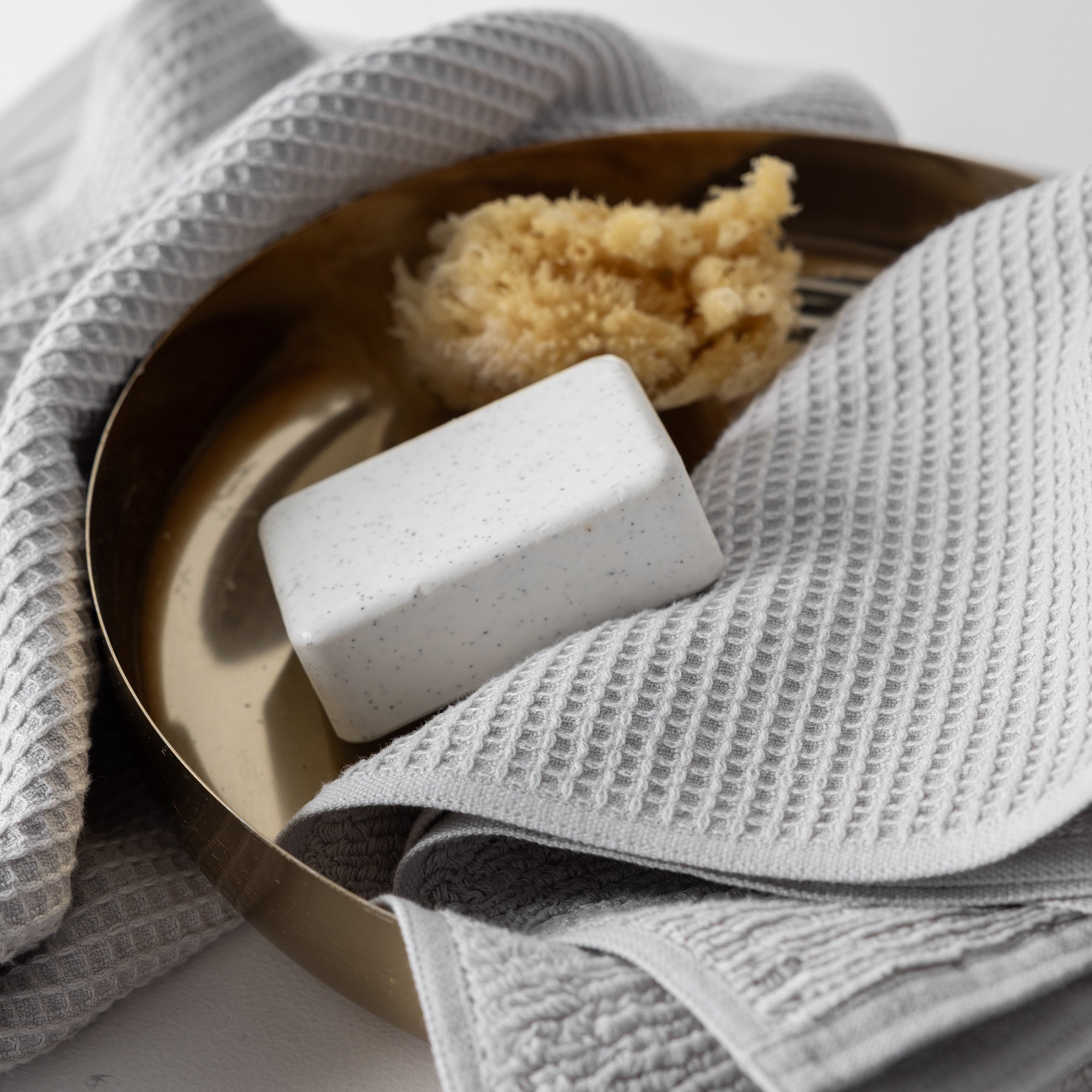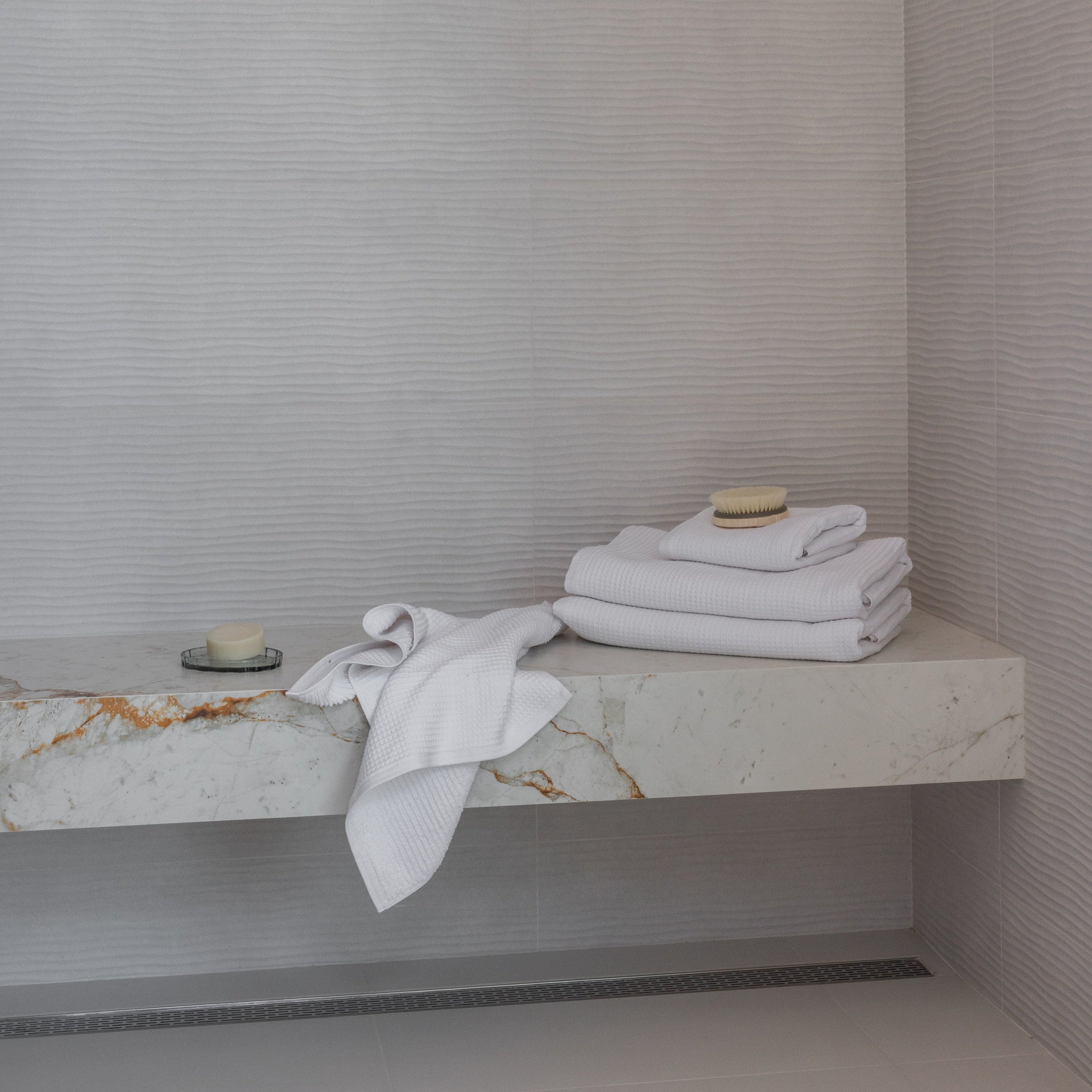 Balanced. Intentional. Lightweight. Get the best of both worlds: airy waffle weave on one side, classic terry loops on the other to ensure breathability, quick absorption and modern texture.